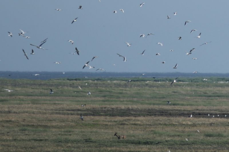 Der untypische Besucher stapfte durch die Düne direkt vor der Hütte und unternahm anschließend einen Rundgang über die Insel. Rotschenkel und Möwen waren über den Eindringling sichtlich empört. Sein Aufenthaltsort war stets deutlich an einer Wolke beunruhigter Vögel zu erkennen. Als er später noch einmal an der Hütte vorbei kam, war er bereits ziemlich vollgekotet.