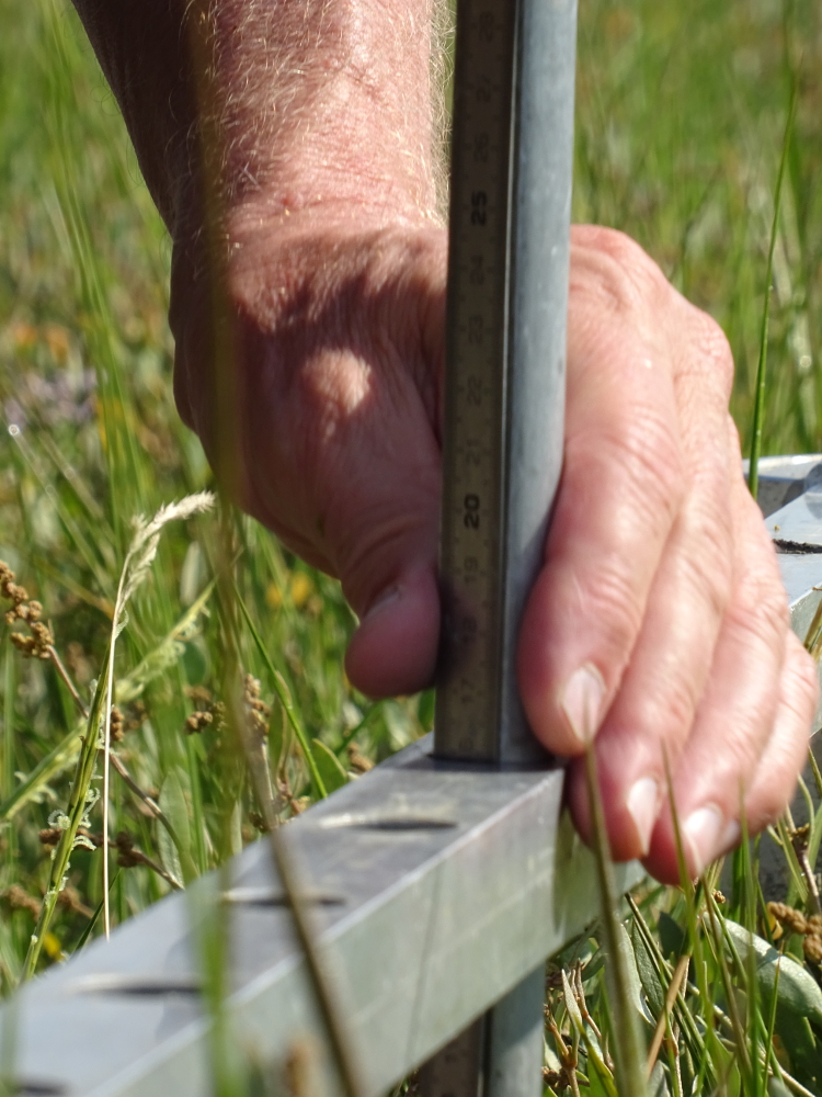 Neben der Vegetationskartierung wird in jedem Jahr auch die Sedimentation anhand der Dauerquadrate gemessen. Zwei der vier Ecken eines jeden Quadrates wird von Kunststoffpfählen markiert, die 1,50 Meter tief in den Boden gerammt wurden und alle fünf Jahre neu eingemessen werden. Martin Stock brachte eine Messlatte mit, mit der er den Abstand zwischen Boden und Messlatte messen und damit die jeweilige Sedimentationsrate berechnen kann.