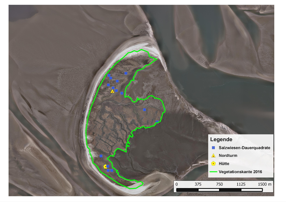 Auch in diesem Jahr wurde die Vegetation auf insgesamt 15 Dauerquadraten aufgenommen. Martin Stock kam hierfür, zusammen mit einem Helfer (Martin Suanjak), von 20. bis 23. Juli zu mir auf die Insel. Für die Schätzung der jeweiligen Deckung einer Pflanze wurde die sogenannte „Londo-Skala“ angewandt.