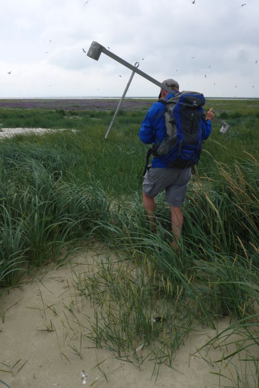 Denn auch auf einer „Vogelinsel“ geht es nicht nur um Vögel, sondern auch um die Grundlage, dass die Vögel hier sein können, sprich die Insel und deren Vegetation. Das Wattenmeer im allgemeinen und Trischen im Besonderen ist ein sehr dynamischer, sich ständig verändernder Lebensraum. Daher reicht es nicht, sich die Insel einmal anzuschauen, und dann weiß man, wie sie aussieht. Stattdessen muss in regelmäßigen Abständen kontrolliert werden, um so Veränderungen feststellen zu können. So wie in jedem Jahr die Brutvögel kartiert und gezählt werden, so wird auch jedes Jahr die Insel „erfasst“. Dazu gehört natürlich die Fläche der Insel. Doch dazu in einem anderen Beitrag mehr. Weiterhin Vegetation und Höhe, um die soll es im folgenden gehen soll. Zu diesem Zweck bekam ich auch wieder einmal Besuch vom Festland, Martin Stock von der Nationalparkverwaltung, der diese Erfassung seit mehr als einem Jahrzehnt macht.