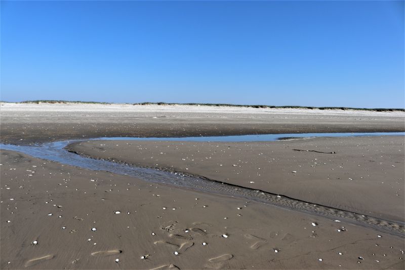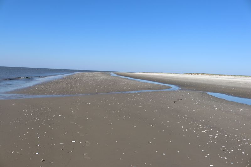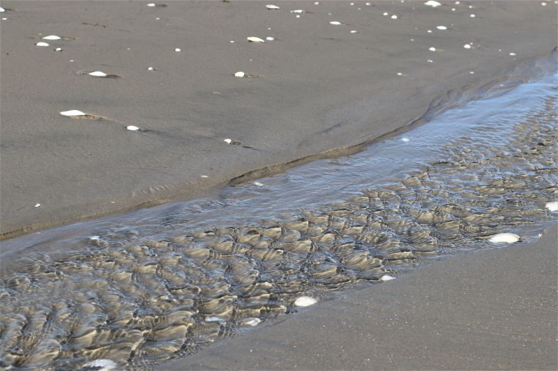 Während der Wind die Dünen wachse lässt, drückt er, weil er nun schon eine ganze Weile aus Osten kommt, das Wasser hinaus und verursacht weiterhin meist niedrige Wasserstände. So hat sich inzwischen durch Ablagerungen ein kleiner Wall gebildet, der relativ nah an der Wattkante am Strand verläuft. Wenn dann doch einmal, wie zum Beispiel heute, der Wasserstand wieder etwas höher ist, schwappt das Wasser, wenn es seinen Höchststand erreicht hat, über diesen Wall. Als Folge bilden sich längliche „Miniseen“ auf der anderen Seite des Walls. Doch wenn das Hochwasser vorbei ist und die Ebbe einsetzt, möchte das Wasser zurück hinaus ins offene Meer. Und Wasser hat sehr viel Kraft, auch wenn es sich hier um nicht all zu große Wassermassen handelt. So bilden sich kleine Priele, die diese plötzlich entstandenen Seen größtenteils wieder leeren.