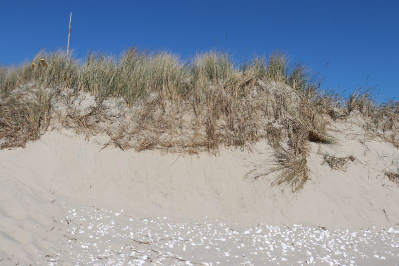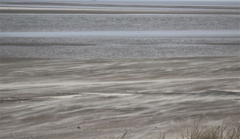 Während Ende März die klaffende Abbruchkante, verursacht durch die Winterhochwasser, das Dünenbild prägten, weht nun immer mehr Sand die Dünen hinauf und lässt sie wachsen. Beeindruckend wabert der Sand, getrieben vom Wind am Strand entlang. Das Foto kann dieses Naturschauspiel leider nicht einmal ansatzweise darstellen.