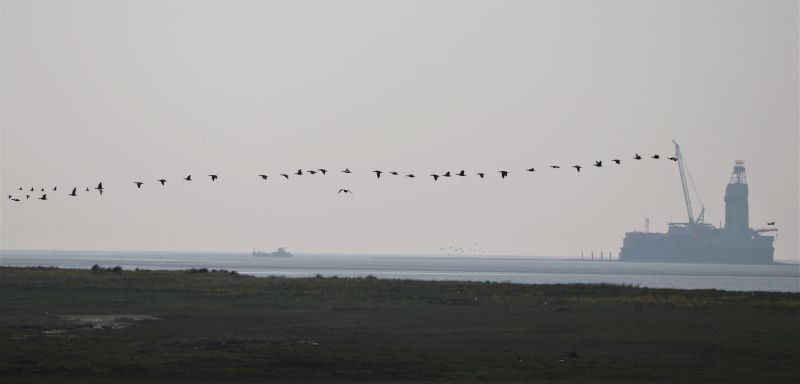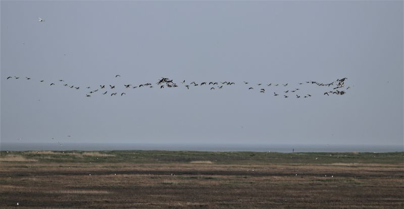 Es kündigte sich schon am Vortag an: Die Temperaturen stiegen um ein paar Grade und die Insel war voll von schwirrenden Insekten. Für Samstag hatte ich mir vorgenommen den südlichen Teil der Salzwiese zu begehen und die dortigen Brutvögel zu kartieren. Also machte ich mich früh morgens los. Immer wieder hob ich während der Kartierung den Kopf gen Himmel und Horizont, denn endlich war es soweit: Die Weißwangengänse kamen – und zwar in Massen. So musste ich neben den Brutvögeln eben auch die Gänse dokumentieren. Später ging es von der Hütte aus weiter. Immer wieder hörte ich die etwas „bellend“ klingenden Weißwangengänse und dann tauchten sie in Trupps von durchschnittlich 150 Individuen aus dem Dunst im Westen auf. Das war schon beeindruckend. Mal aufgereiht und gut zählbar, mal ganz durcheinander und mit eine paar Graugänsen dazwischen – Alle wurden sie erfasst.