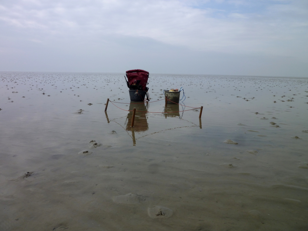 An den Tagen 2. und 3. April habe ich, jeweils um Niedrigwasser (14:04 Uhr und 15:42 Uhr), das Watt um Trischen untersucht. Dabei bin ich nach einer standardisierten Methode der sog. „Raster-Blitz-Kartierung“ vorgegangen. Die Methode wurde von Mitarbeitern der Schutzstation Wattenmeer e.V. entwickelt und wird schon seit dem Jahre 1991 an verschiedenen Stellen im Wattenmeer durchgeführt. Mithilfe der Kartierung sollen langfristige Veränderung des Artenspektrums und die Populationsdichten einiger wattbewohnenden Arten erfasst werden.