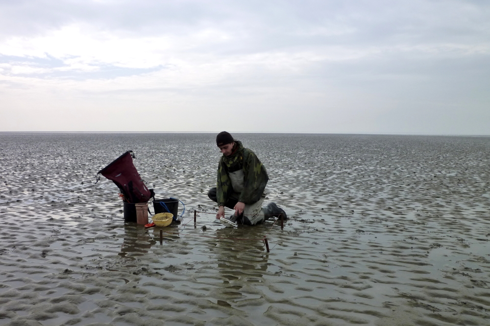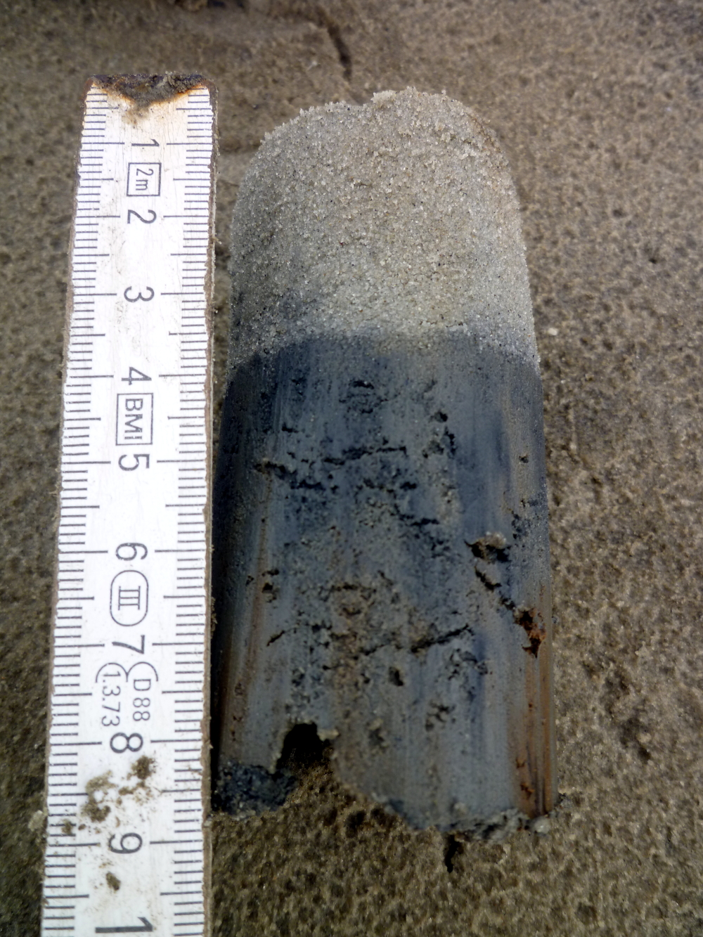 An einem Probenpunkt angelangt, wird zunächst einmal ein Quadrat von 1 x 1m abgesteckt. Dann wird nach unterschiedlichen Spuren von Wattbewohnern (wie z.B. den Wattwurm-Häufchen (Areniclola marina) oder den Atemlöchern der Sandklaffmuschel (Mya arenaria) oder Wattschnecken (Hydrobia ulvae) gesucht und ausgezählt. Im Anschluss daran wird mit zwei unterschiedlichen Stechröhren jeweils ein Probenkern gezogen und ausgesiebt. So können Muscheln, Schnecken und Würmer, die sich im Wattboden befinden, leichter entdeckt, gezählt und vermessen werden. Außerdem lässt sich an so einem Probenkern genau ablesen bis wohin die sog. „Oxidationsschicht“ reicht. Sie lässt sich ganz einfach durch ihre hellgrau / -braune Färbung von der dunkelblau bis schwarz gefärbten „Reduktionsschicht“ unterscheiden. Innerhalb der Oxidationsschicht werden Nährstoffe und tote Materialien von Bakterien unter Sauerstoffverbrauch abgebaut und in andere Stoffe umgewandelt. In dieser Schicht befinden sich meist auch die Muscheln und Würmer. In der Reduktionsschicht hingegen ist kein Sauerstoff mehr vorhanden, was eine Reihe von reduzierenden Bakterien auf den Plan ruft: Diese können, unter Ausscheidung von Schwefelwasserstoff (H2S), auch ohne Sauerstoffverbrauch leben. Der Schwefelwasserstoff ist übrigens für den etwas fauligen, oft an faule Eier erinnernden Geruch des Watts verantwortlich. Je nach Watttyp kann die Oxidationsschicht mal stärker oder weniger stark ausgeprägt sein. Während sie im Schlickwatt nur wenige Millimeter dick ist, kann sie in Sandwatt bis zu 10 cm tief sein.