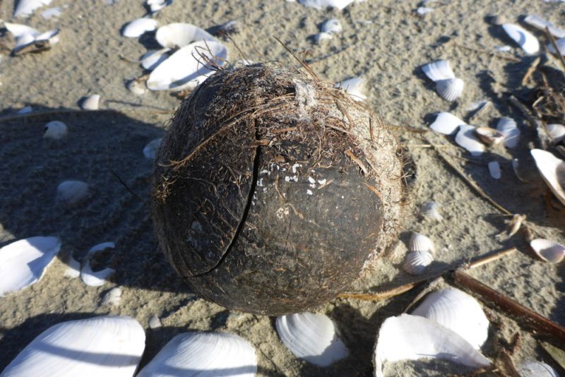Wo gibt’s denn so was? Zwar scheint die Sonne am strahlend weißen Sandstrand, aber für die Tropen ist es doch wohl noch etwas kühl. Was also, macht eine Kokosnuss am Strand von Trischen? Ist sie wirklich den ganzen Weg aus warmen Gefilden bis hier her verdriftet? Ich weiß es nicht. Wahrscheinlicher ist jedenfalls, dass sie von einem der vielen Schiffe von Bord geworfen wurde, die in der nahen Elbe vorbeifahren, oder noch von einer Strandparty des letzten Sommers stammt. Wie auch immer, leider war sie schon geöffnet.